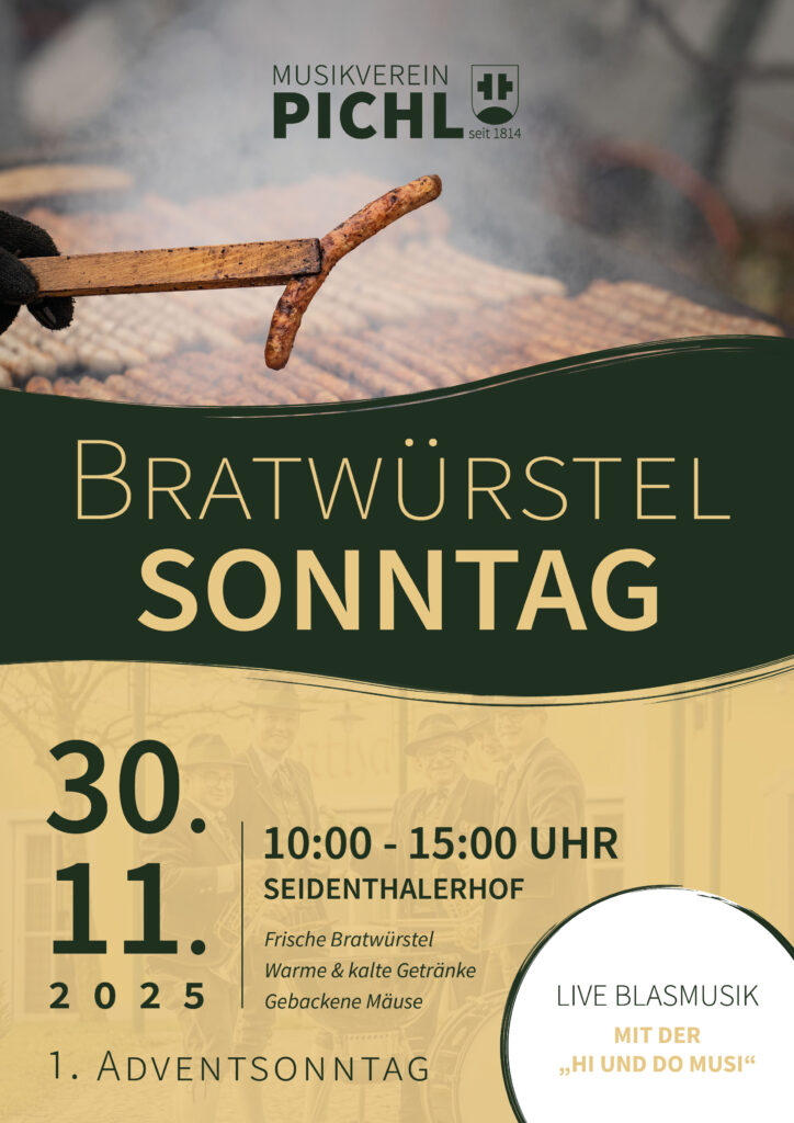 Seit 1814 Musikverein Pichl Bezirk Wels-Land, Oberösterreich Jahre 1 Mitglieder 1 Altersdurchschnitt 1 Bratwürstelsonntag 1. Adventsonntag 30. November 10:00 – 15:000 Uhr LIVE-Blasmusik mit der HI UND DO MUSI Seidenthalerhof Mitterleiten 4, Pichl bei Wels Herbstkonzert 2025 8. November Einlass: 18:00 UhrBeginn: 19:00 Uhr im Turnsaal der Mittelschule Pichl Zur Herbstzeitung Unsere Unterstützer
